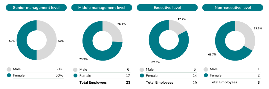 Maintaining a working environment that encourages mutual respect among all employees regardless of position, and embracing diversity is a key aspect of working at the Manager. We are pleased to report that we have maintained a significant proportion of women at all levels and 50% of our employees at senior management level are women.